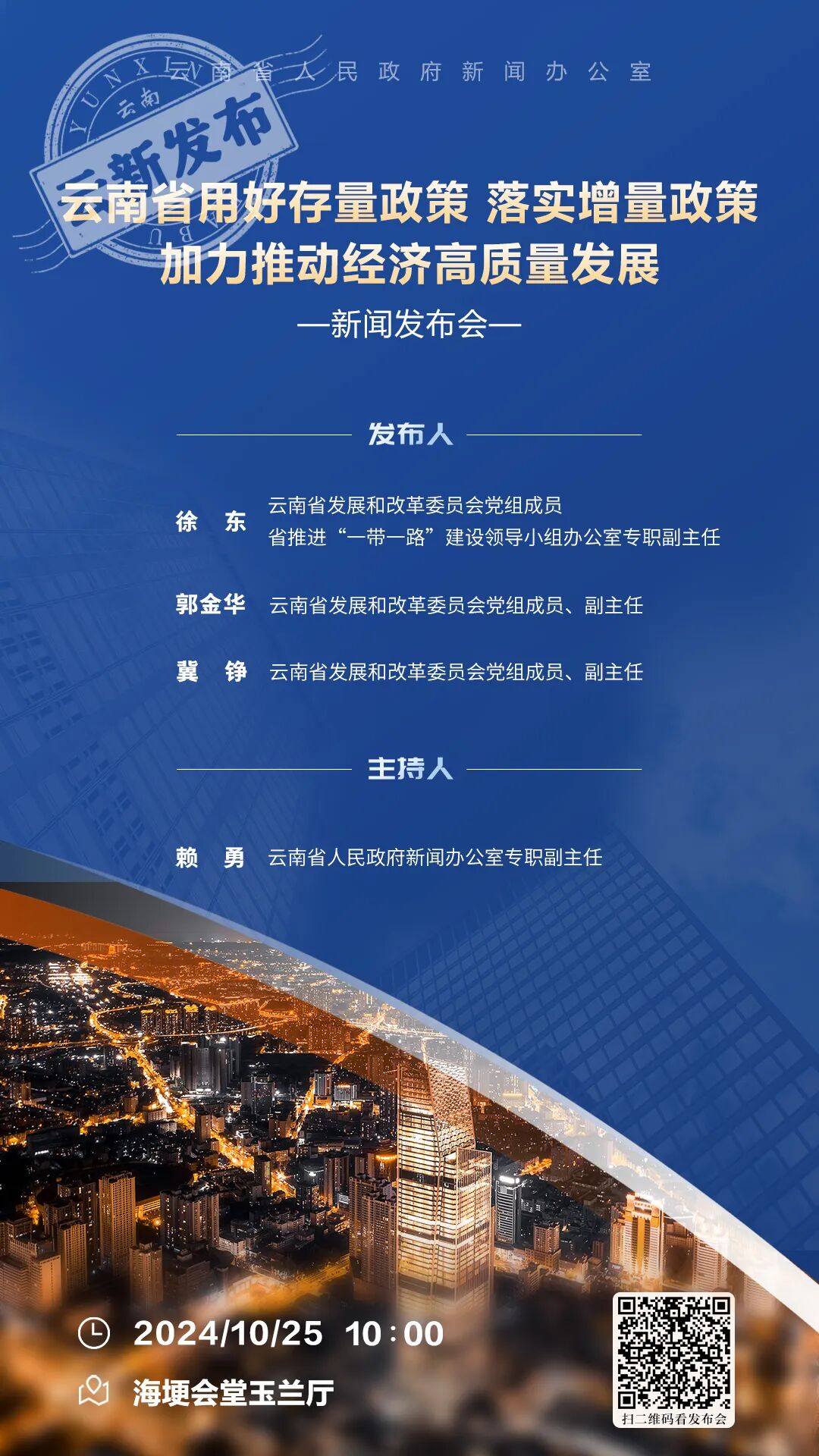 10月25日,云南省人民政府新闻办公室在云南海埂会堂玉兰厅,举行云南省用好存量政策 落实增量政策 加力推动经济高质量发展新闻发布会,邀请省发展改革委向社会公开介绍相关情况并回答记者提问。