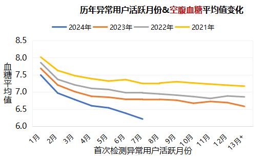 随着慢病管理项目进展及慢病知识普及,慢病多指标的检测的需求快速增长,健之佳不断满足顾客需求,持续投入检测设备及检测人员,极大满足顾客需求。通过持续四年的惠及大众的自助筛查,健之佳的服务取得了显著成效。整体数据显示,检测异常人群发现率高达到63%,到2024年第三季度末,异常率下降为59%,达标率也从2022年的37%提升到2024年的41%。帮助8万人实现指标达标。在单指标改善方面,血糖的管理尤为明显,对历年首次血糖检测异常用户的跟踪数据显示,接受慢病管理项目服务月份越多,血糖均值控制越好。数据显示,血糖异常用户通过2—3年的持续慢病管理,血糖均值下降11.3%,而通过更长时间的管理,血糖值下降更多。在21年开始接受慢病管理的糖尿病患者中,空腹血糖均值从2021年的8.0mmol/L下降到2024年7月的6.2mmol/L,餐后血糖均值从2021年的10.8mmol/L下降到2024年7月的7.9mmol/L,下降幅度分别达到空腹22.5%,餐后26.8%。血压管理数据显示,留存用户对血压监测的依从性也得到了很大提升,年检测次数从2021年的1.75次提升到2023年的5.2次。血脂管理方面,2022-2024年期间,血脂异常率显著下降,达标率显著上升,由2022年的18.7%提升到2024年的24.5%。上述数据表明,持续的专业慢病管理服务确实极大的改善了患者的指标情况。